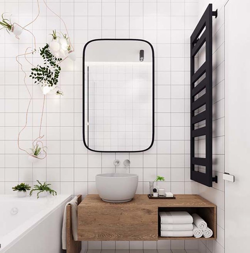 Gương treo tường nhà tắm khá đa dạng về kiểu dáng tùy vào thiết kế và diện tích phòng tắm mà bạn lựa chọn kiểu dáng gương cho phù hợp. Nếu nhà tắm theo xu hướng đơn giản, diện tích nhỏ và màu chủ đạo là màu trầm thì bạn có thể lựa chọn gương hình vuông, hình chữ nhật hoặc hình tròn khung gỗ. Khung gỗ bên ngoài sẽ giúp gương bắt mắt và hài hòa với chất liệu kính.